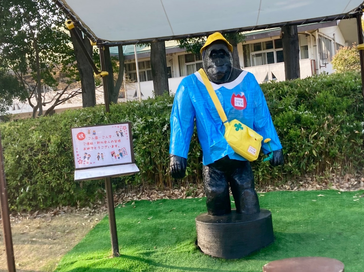 大泉緑地へ出向くとゴリラ君が「お肌の手入れ」も終わって幼稚園児になってたたわ。メッセージは「祝 ご入園・ご入学・ご進級・新社会人の皆様おめでとうございます」と書いてあったよ。喜ばしいね。